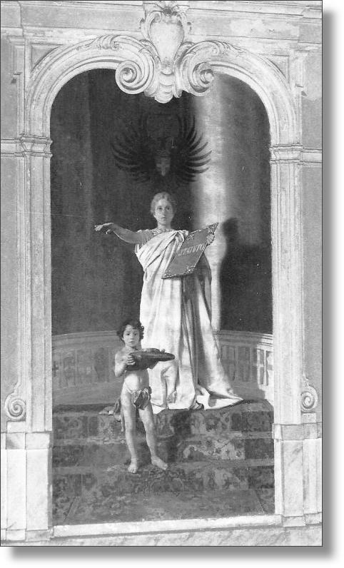 "La Monarchia giura fedeltà allo Statuto" . (Immagine tratta da: A.Manzitti - L'EPOPEA DEL RISORGIMENTO DIPINTA DA CESARE VIAZZI NELLO SCALONE DI PALAZZO RAGGIO A GENOVA - Ufficio informazione turistica PREDOSA (AL) - Genova 2011 - pag.8)